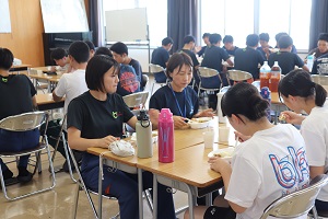 令和5年8月4日(金)米子市では、最高気温36.5℃を記録する猛暑の中、鳥取県消防学校では毎年恒例のオープンキャンパスを開催した。今年度のオープンキャンパスは、現在入校中の初任科学生14名が自ら主体となって広報活動から企画・運営まで行った。来校した28名の若人は様々な消防訓練を体験し、また昼食では教官監修学生手作りの《消防カレー》が振る舞われ、そのあまりの美味しさに皆舌鼓を打っていた。