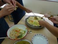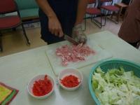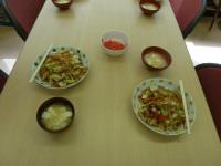誕生日月の奇数・偶数で参加者を2グループに分け、テーブルごとで作業を開始。キャベツ・ニンジンの野菜切りは、4月からの積み重ねでかなり腕前が上達。もやし・麺をほぐして、豚肉をカット。それぞれの具材と麺を炒めていよいよ合体。「けっこうボリュームがあるなあ」「しっかりひっくり返してよ」「これぐらいの焦げ目でいいかな」などのつぶやきと同時に、ホットプレート上は大賑わい。あっという間に完成し、「いただきます」のかけ声で会食。紅生姜、かつおぶし、マヨネーズ、ソース追加と各自のトッピングで「おいしい」「うまい」の声と笑顔が続きました。