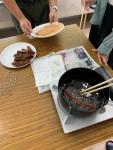今回作ったのは冷やし中華、牛乳寒天でした。どちらも夏の定番メニュー。暑い時でもさっぱりと食べられます。みんな調理実習には慣れたもので、役割分担をしてテキパキと具材を準備したり麺をゆでたりして、あっという間に完成しました。食べ終わってからは、小学校の時の宿泊体験やキャンプの話で盛り上がり、楽しいひと時を過ごしました。