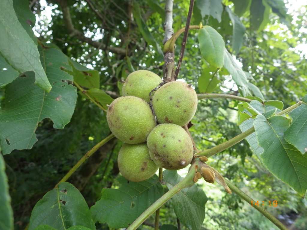 オニグルミ、人間が食べてもおいしいですが、ノネズミやリス等も大好きで食べます。熟すと落果します。果皮はかぶれることがあるので、素手で触らない方がいいです。