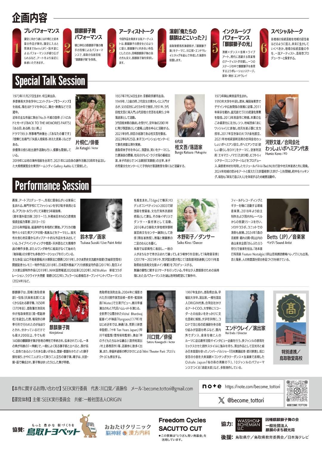 今回作品を発表する各アーティストは、麒麟獅子の歴史をどのように捉え、麒麟獅子と向き合い作品にしたのか。因幡麒麟獅子舞の会の方も交え、麒麟獅子舞を探求します。